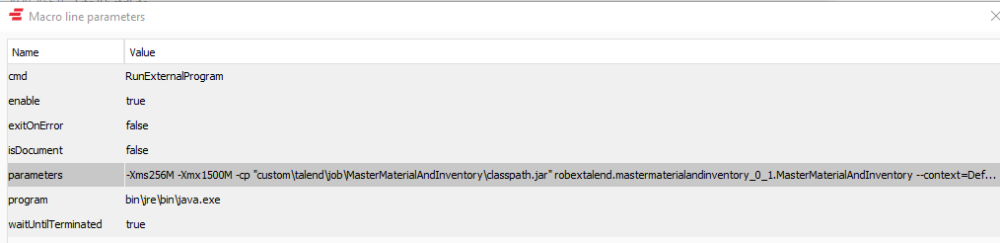 java -Xms256M -Xmx1024M -cp classpath.jar; robextalend.mastermaterialandinventory_0_1.MasterMaterialAndInventory --context=Default %*